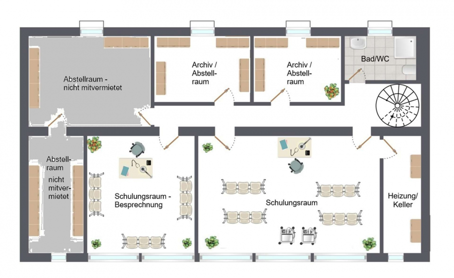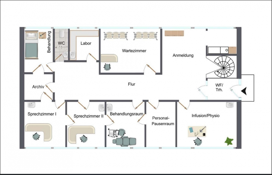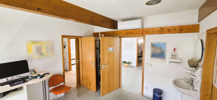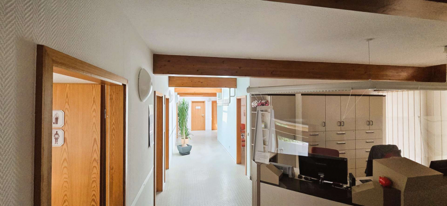 Die Raumaufteilung bietet ein großzügiges Wartezimmer, mehrere Behandlungsräume sowie ausreichend Büro- und Verwaltungsflächen. Ergänzt wird das Angebot durch vorhandene Toilettenanlagen und zusätzliche Kellerräume für Lager oder Archiv.