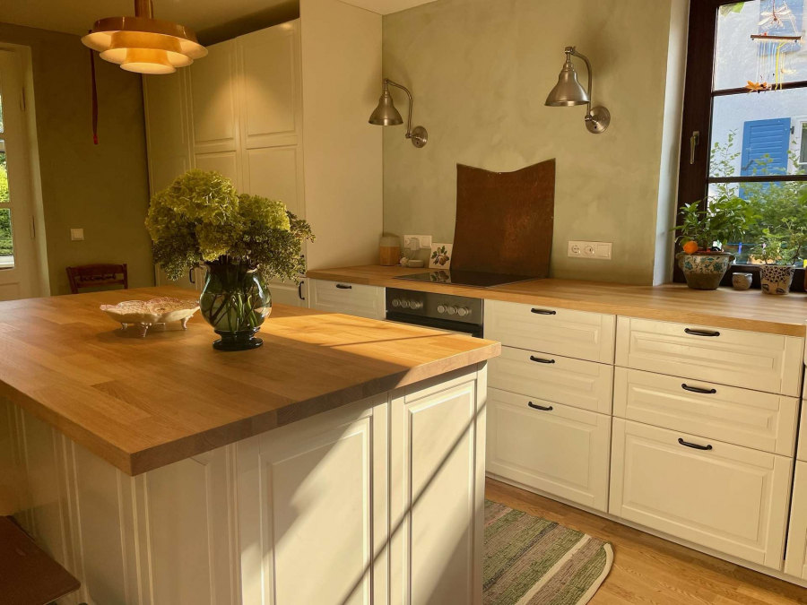 Das Haus wurde im beliebten Landhausstil eingerichtet – warm, einladend und zugleich modern – und orientiert sich dabei am sogenannten Shaker-Stil aus Nordamerika. Dieser zeichnet sich durch schlichte Eleganz, klare Linien, hohe Funktionalität und zeitlose Formensprache aus. Die hochwertige Einbauküche mit Kochinsel, Backofen, Kochfeld und Geschirrspüler bildet das Herzstück des Erdgeschosses und verströmt ein hyggeliges Flair – perfekt für gemütliche Abende mit Familie und Freunden.