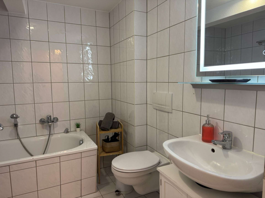 Das Badezimmer verfügt über Badewanne, Dusche und Tageslicht. Ein besonderes Highlight ist die Dachterrasse mit Sitzgruppe und Sonnenliegen, die zusätzlichen Wohnkomfort in zentraler Innenstadtlage bietet.